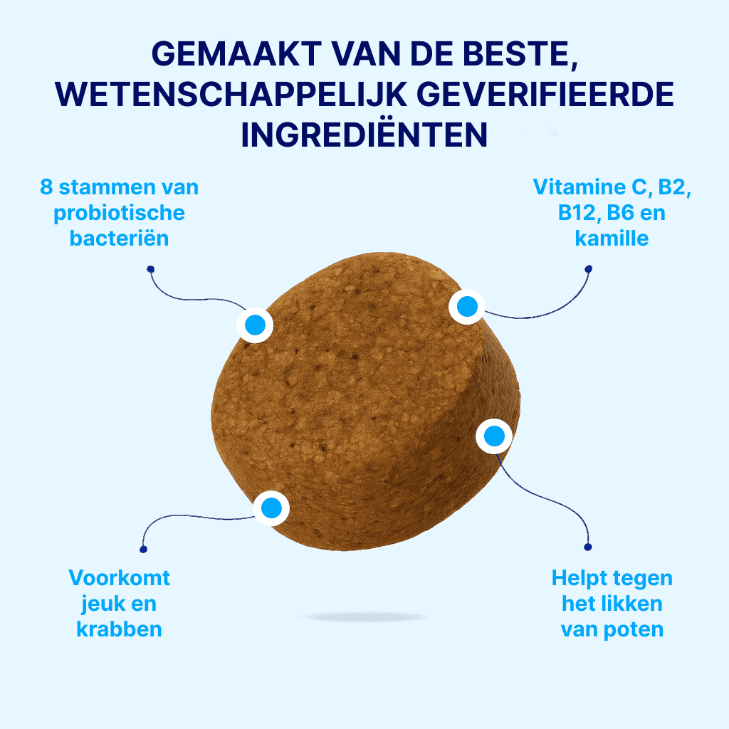 Bevat 8 probiotische bacteriestammen, spijsverteringsenzymen, biologische kamille, kurkuma, passiebloemkruid, Yucca schidigera extract en valeriaan wortel – allemaal wetenschappelijk bewezen om te helpen bij het herstellen van de darmbalans van je hond.
