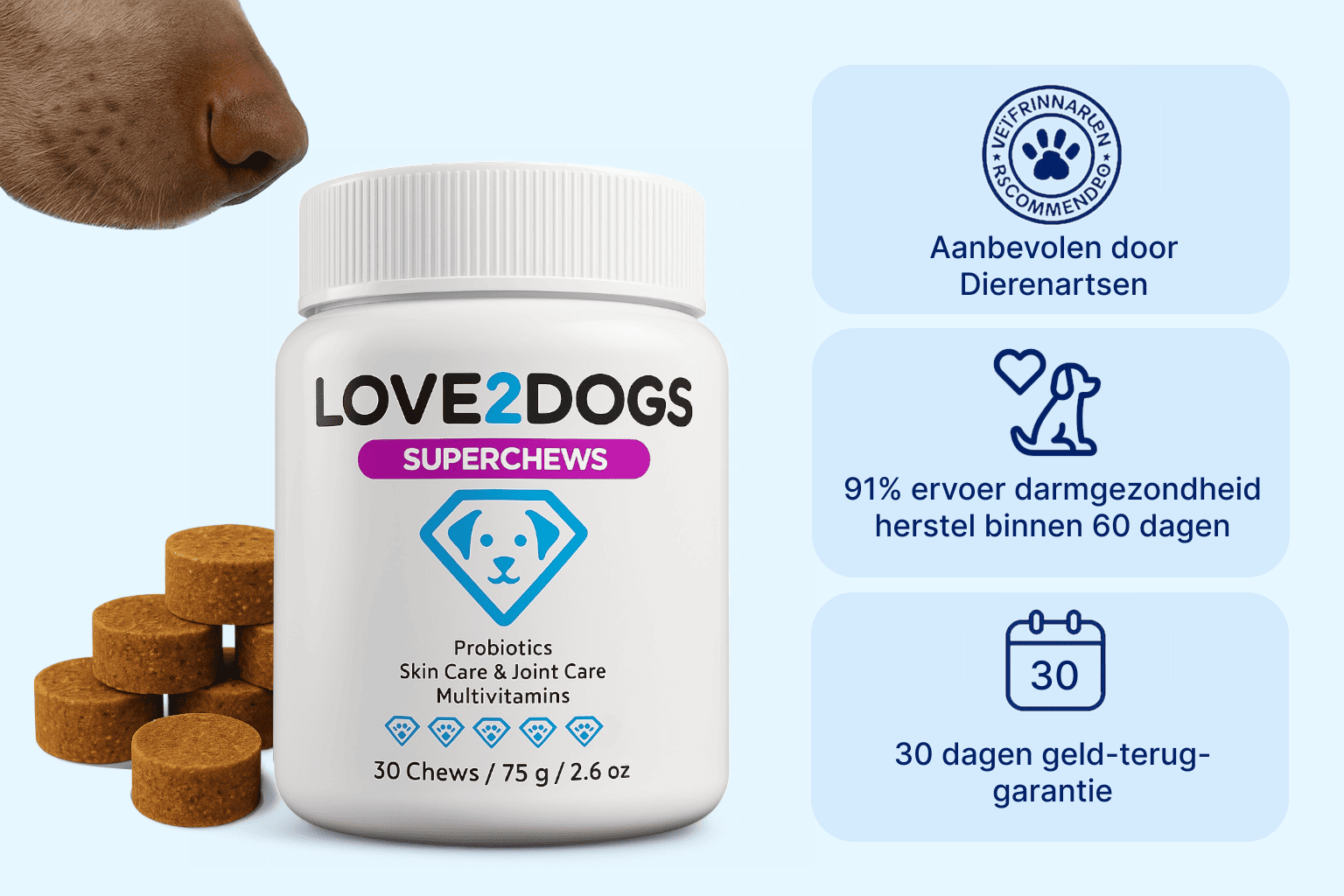 Duizenden huisdiereigenaren vertrouwen op Love2Dogs om de darmgezondheid van hun hond te ondersteunen met bewezen ingrediënten, gepersonaliseerde plannen en echte resultaten. Je eerste stap? Eén kauwtablet per dag.